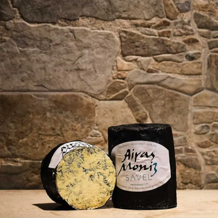 Savel de Airas Moniz es un queso azul gallego elaborado en Chantada con leche cruda de vacas Jersey en pastoreo. Tiene ese perfil que llama la atención desde el primer momento por su olor intenso, pero luego sorprende por una boca mucho más fina de lo que uno espera: untuosa, elegante y muy equilibrada. Es un azul con personalidad, sí, pero trabajado con mucha precisión, de esos que dejan recuerdo sin volverse agresivos. La presencia de vetas azuladas y gris verdosas, junto a la pasta amarilla propia de la leche de vacas Jersey, le da además una imagen muy reconocible. En Airas Moniz lo maduran durante unos dos meses en cava con penicilium roqueforti, y ahí está buena parte de su carácter.