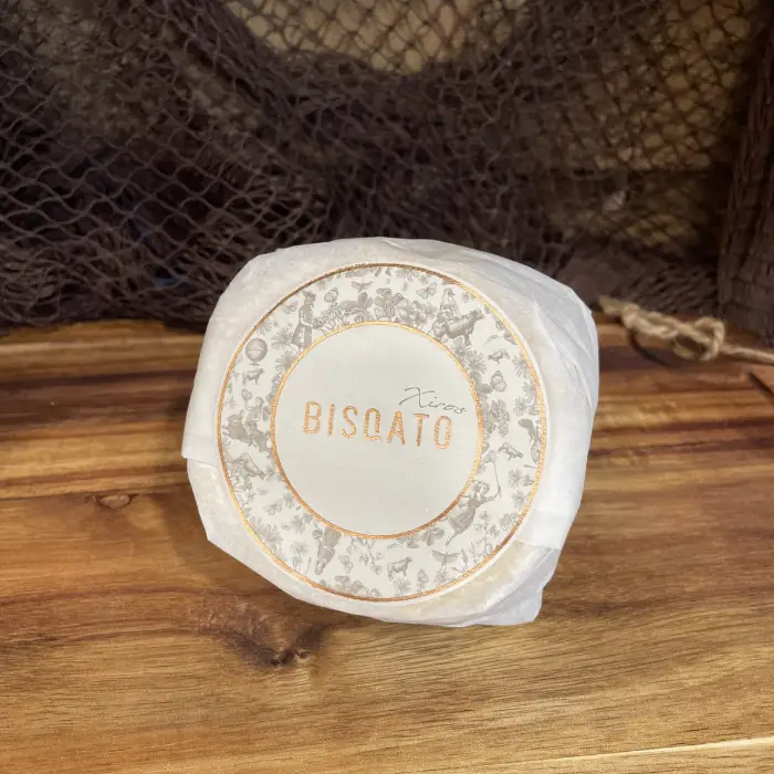 Xirós de Bisqato es un queso gallego de vaca elaborado con leche cruda en Guitiriz, Lugo, por la quesería Bisqato. Es una pieza de pasta blanda y corteza enmohecida que recuerda al estilo de un camembert, pero con un carácter muy de aquí: aroma marcado, textura cremosa y un fondo de pasto y montaña que le da mucha personalidad. Debajo de esa apariencia fina y delicada hay un queso con bastante expresión, de esos que en tabla llaman la atención en cuanto se abre. Se elabora de forma artesanal con leche entera de vacas en pastoreo, y eso se nota en la profundidad del sabor y en esa cremosidad tan agradable cuando está en su punto.